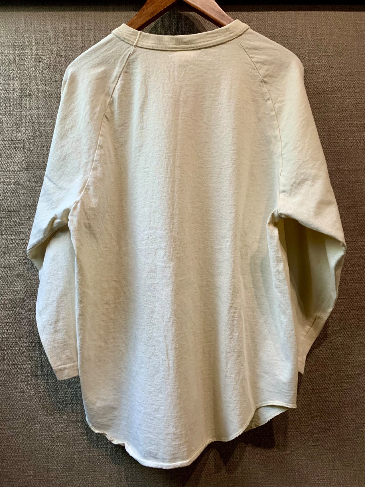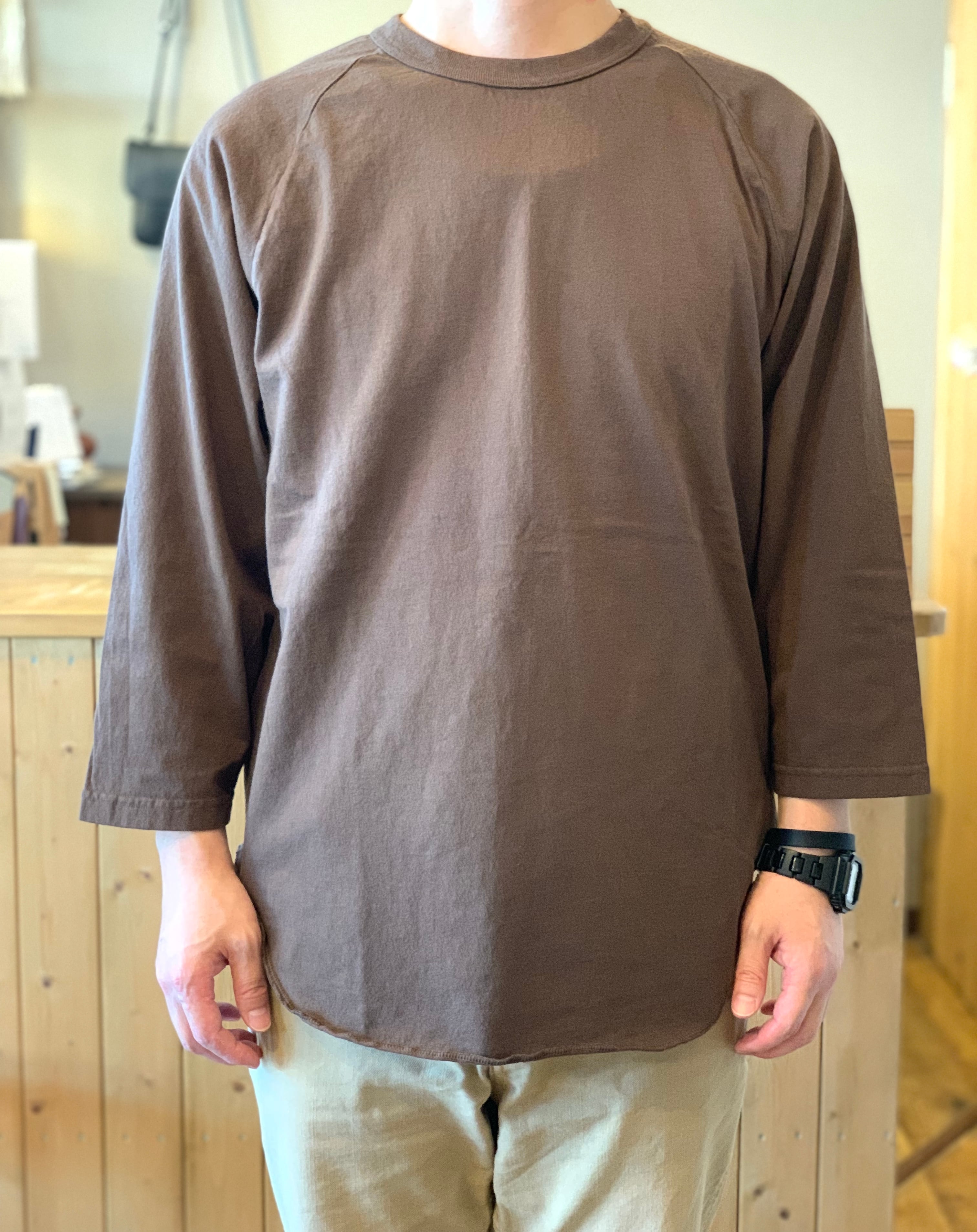 サイドに縫い目の無い丸胴仕様、ラグランスリーブ、ネックのバインディング、裾のラウンドカットが特徴です。