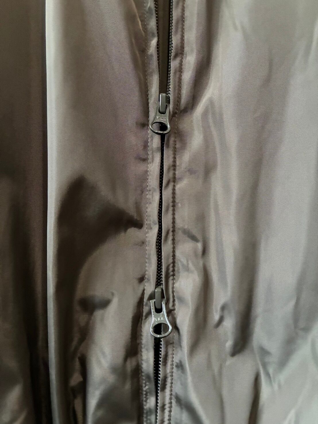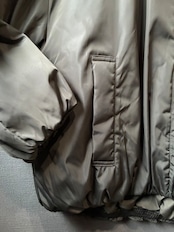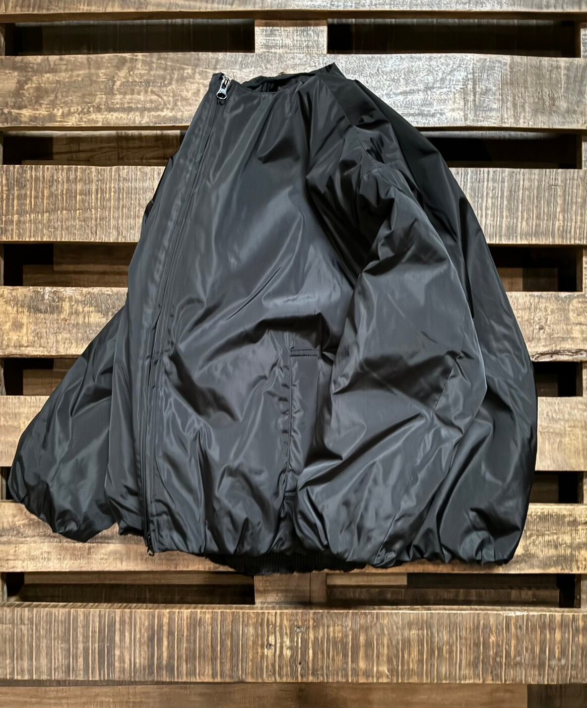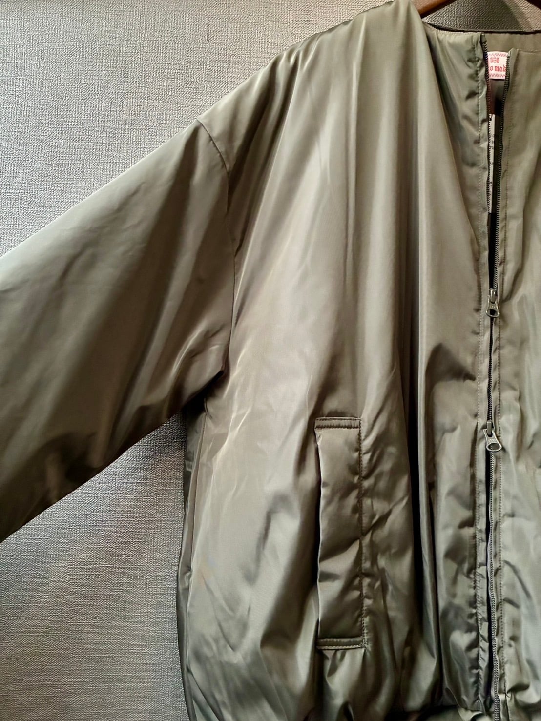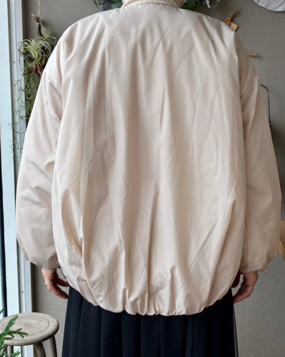 ハリとツヤのあるポリエステルのヴィンテージ生地を表面に使用し、裏地には中綿のキルティング加工を施したコクーンシルエットのブルゾンです。