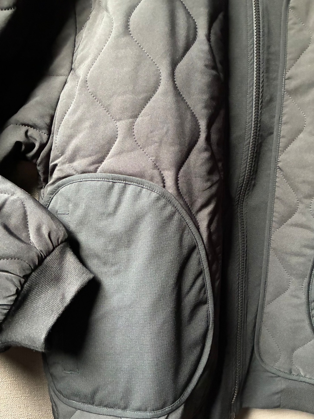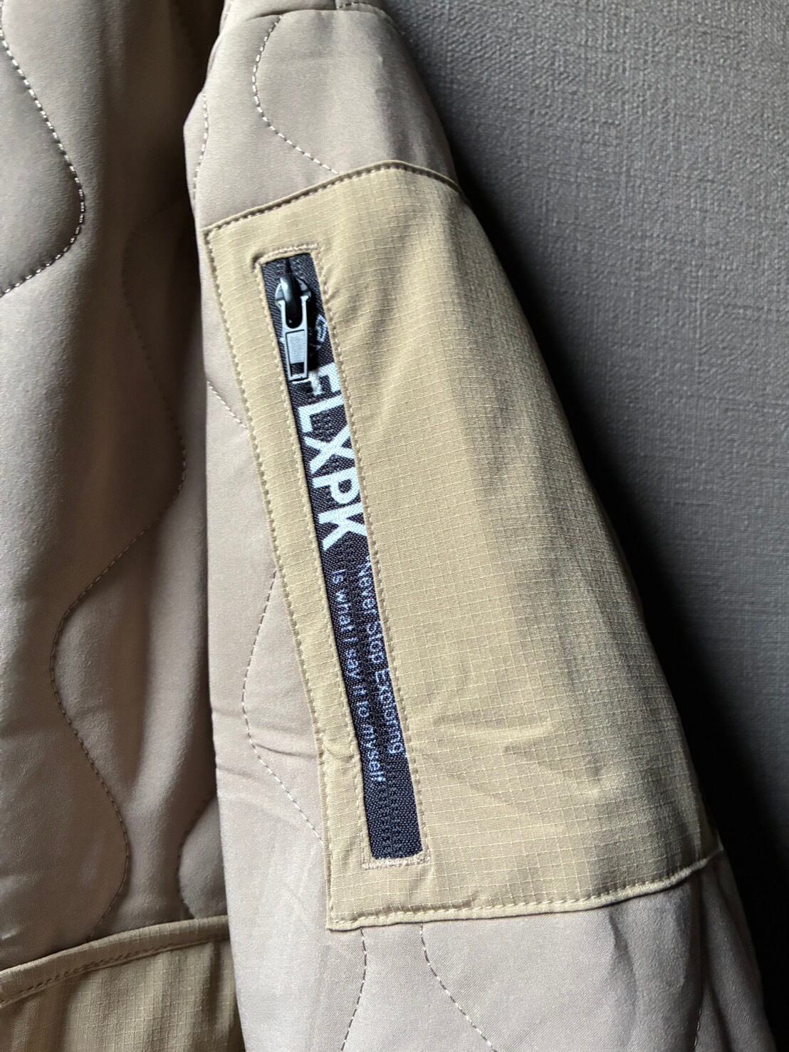 左袖にはリップストップ素材のロゴ入りファスナーポケットを装備し、実用性とデザインを両立。