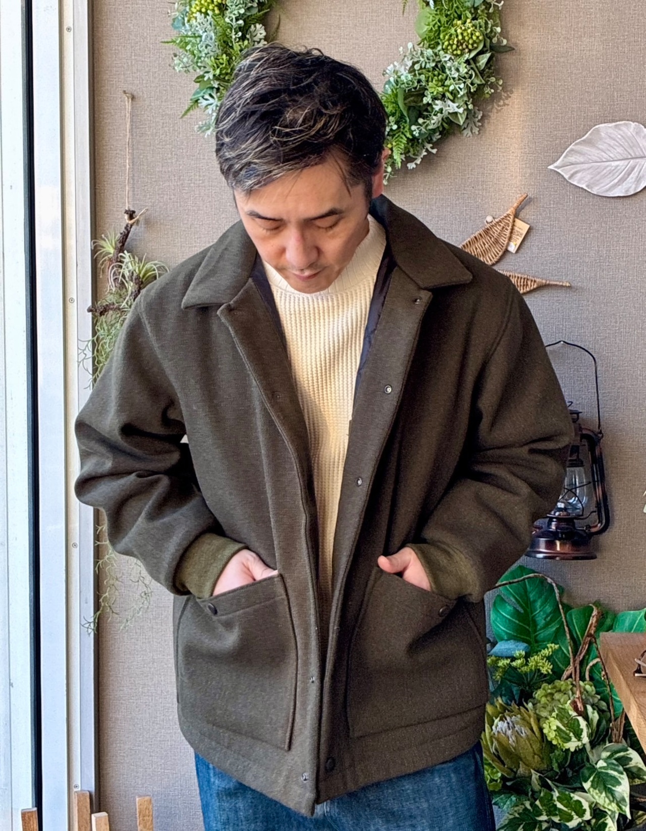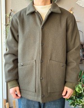 このアワードジャケットは1900年代初頭の雰囲気を出すため縮絨を行わず洗い加工のみを施し柔らかさや光沢感を抑えた風合いにしました。