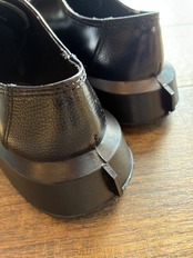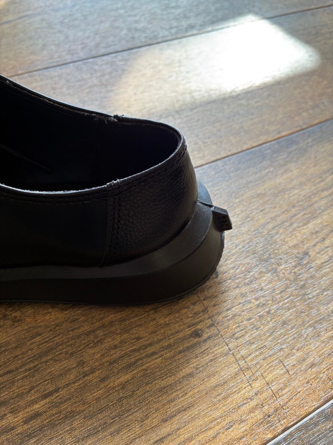 靴のデザインで最も目を引くボリュームのあるソールは、踵の後ろ部分まで出っ張り、「バリ」をかたどったヒールパッチが製法のアイコンとして存在。