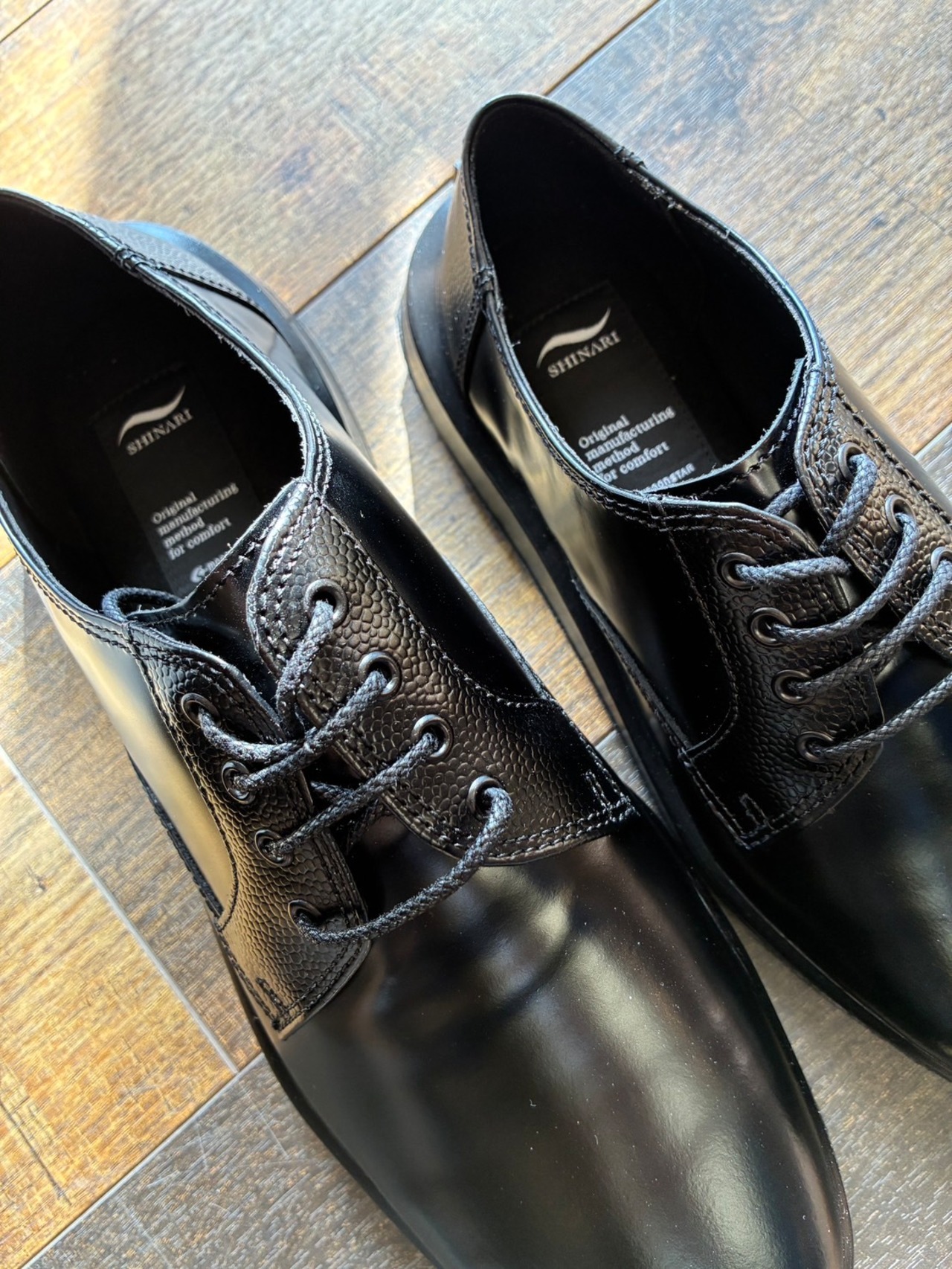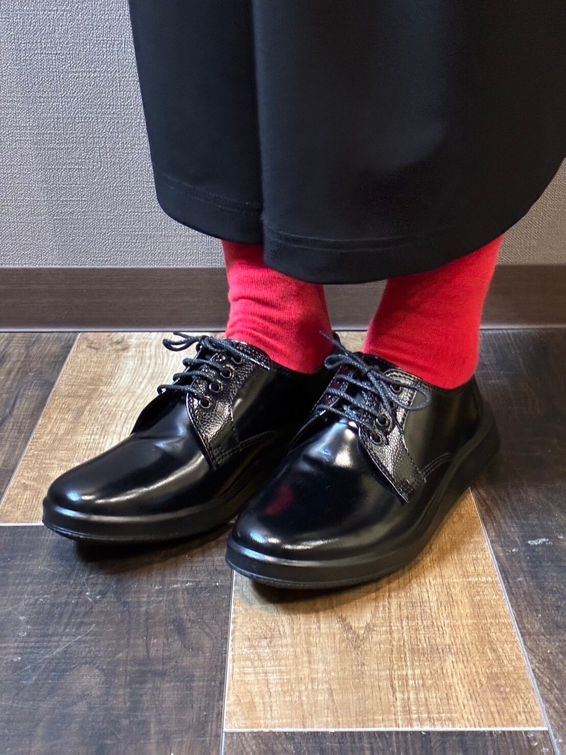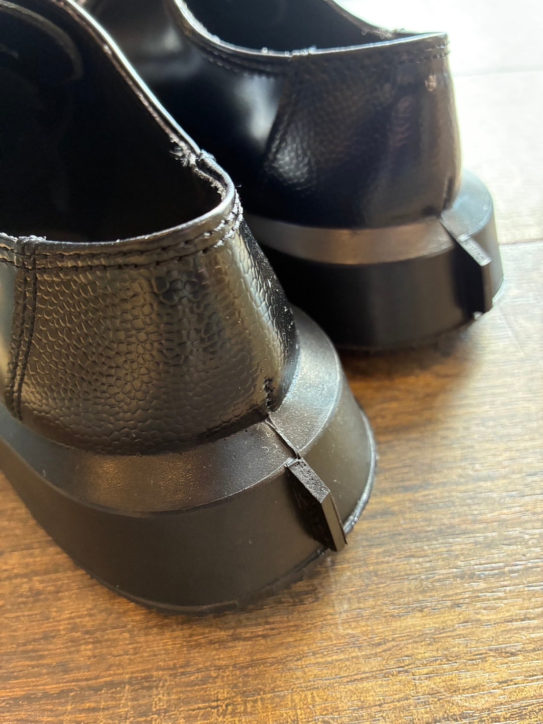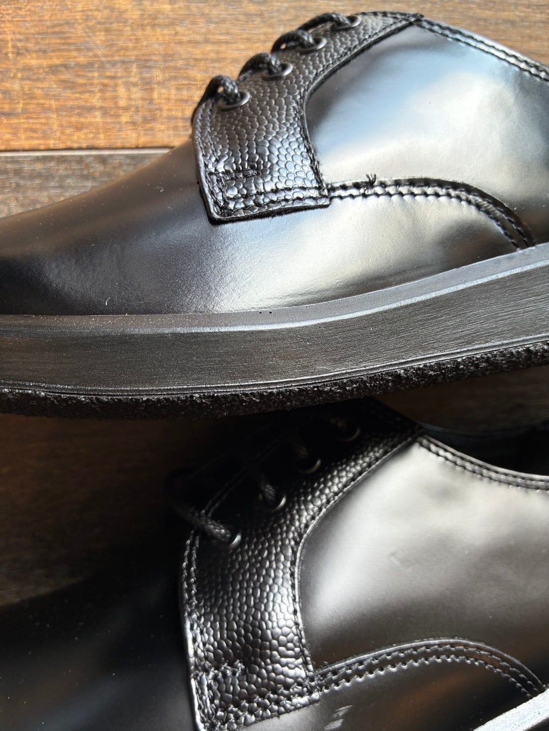 アッパーには光沢のあるガラスレザーを使い、シューレースホール周りとヒールのパーツには型押しレザーを採用。