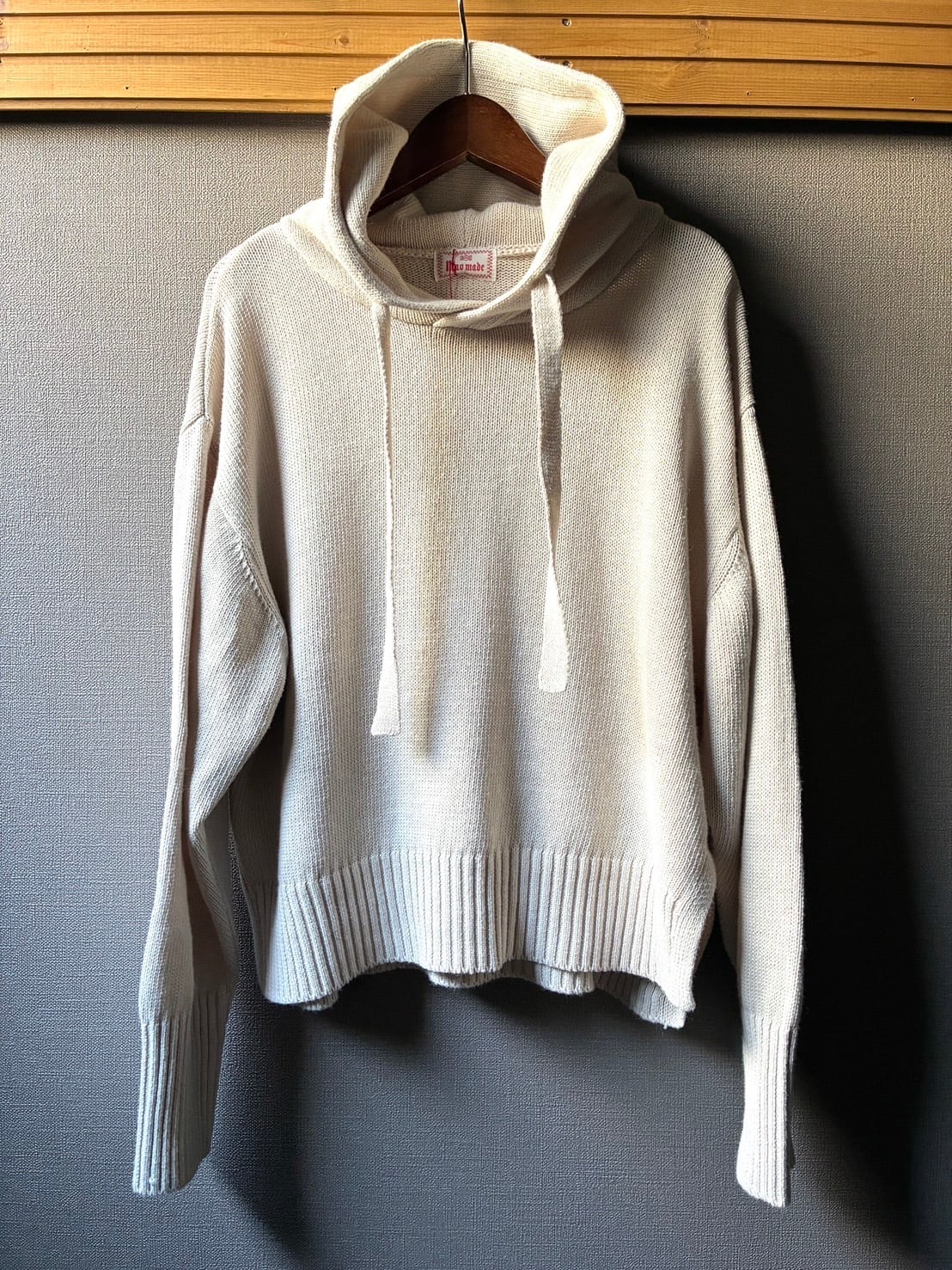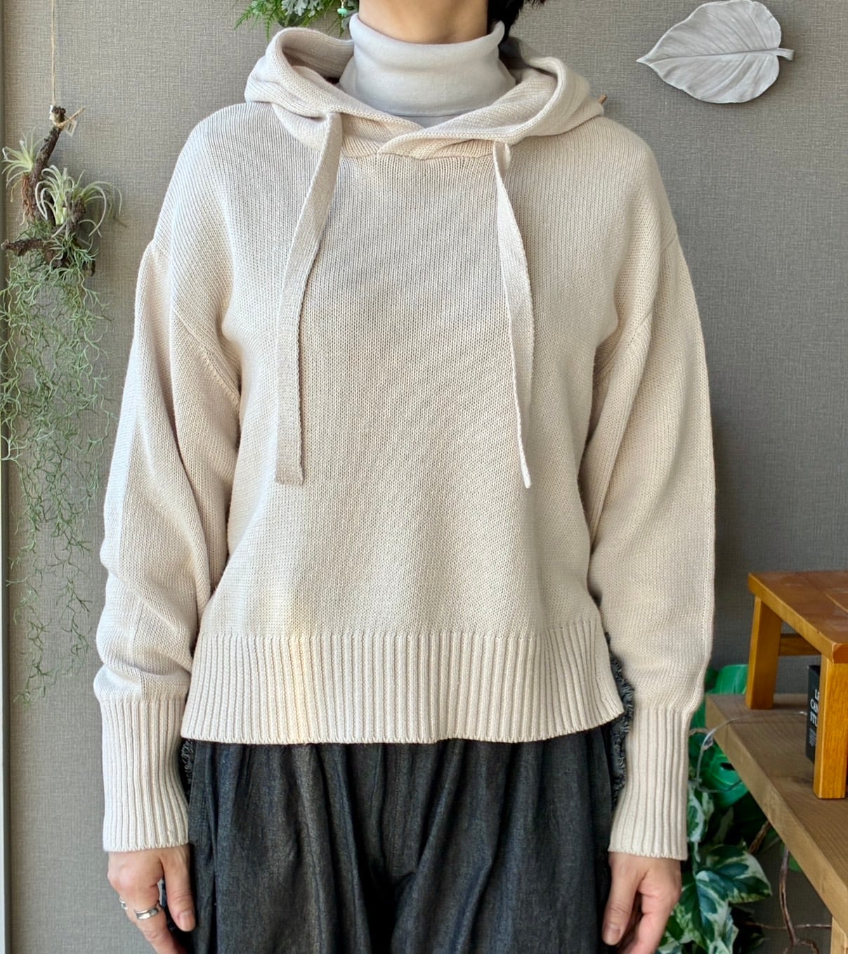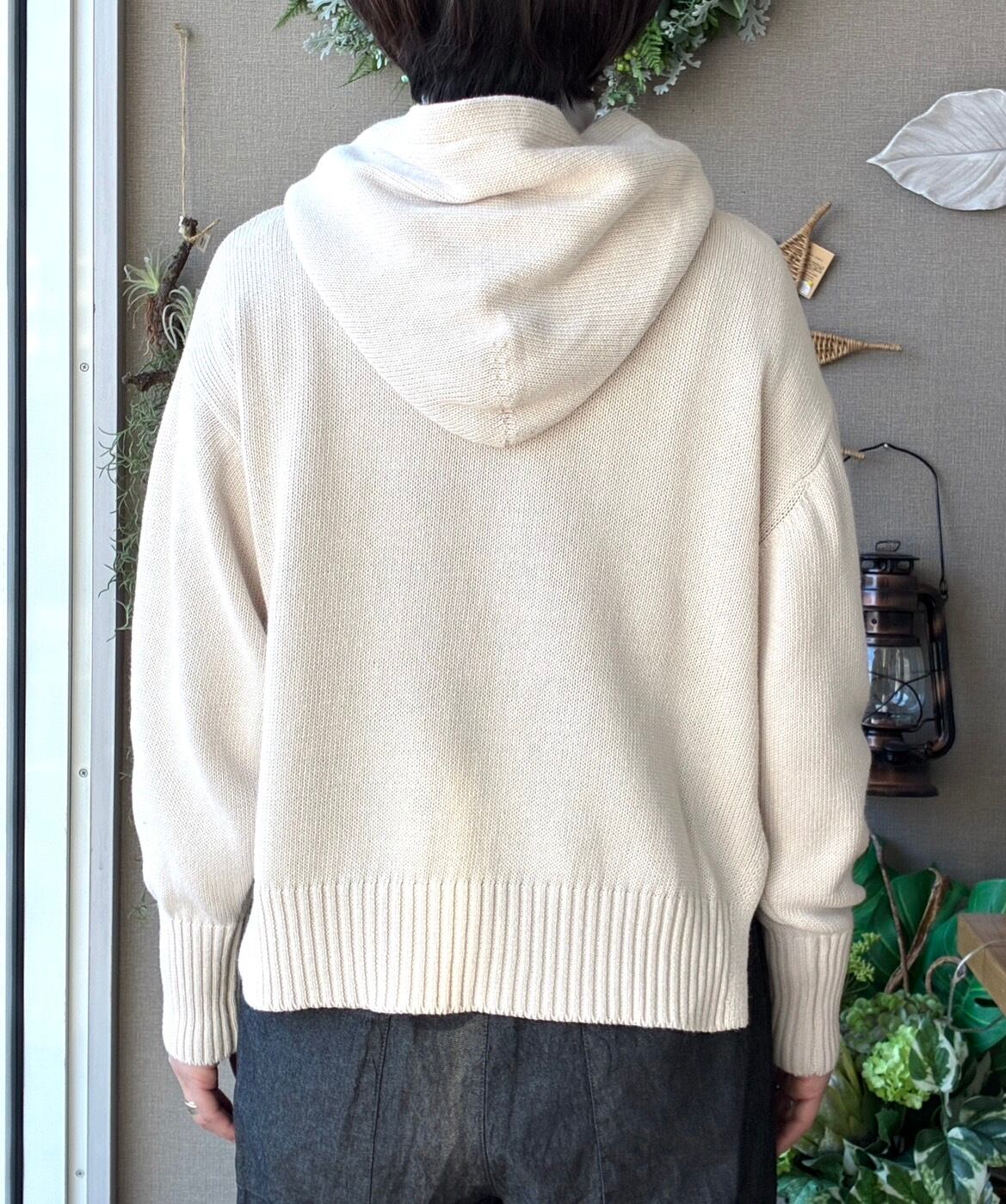 袖口の長めリブや、平たく太めのフード紐など、さりげないディテールにもこだわりが感じられます。