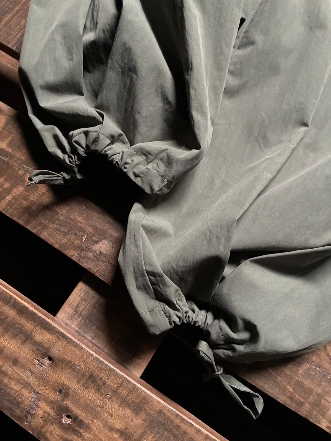 裾に施されたタックとドロスト(引き紐)仕様で紐を絞ることでバルーンのようなボリューム感のあるシルエットに変化。
