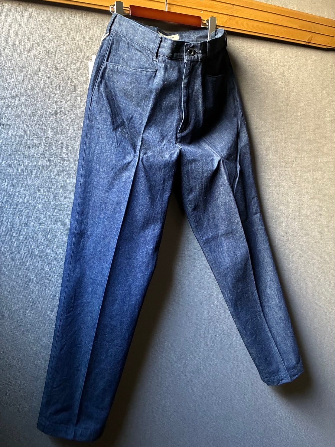 緩やかなテーパードラインやセンタープレス、ドレスパンツに見られるディテール使いもポイントで、通常のデニムパンツとは一味違う雰囲気で着用頂けます。