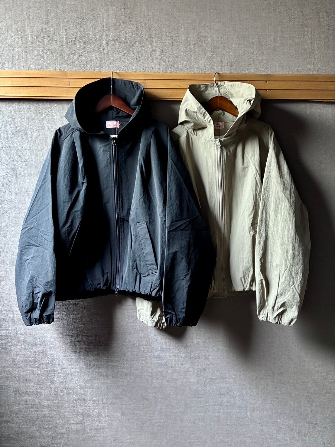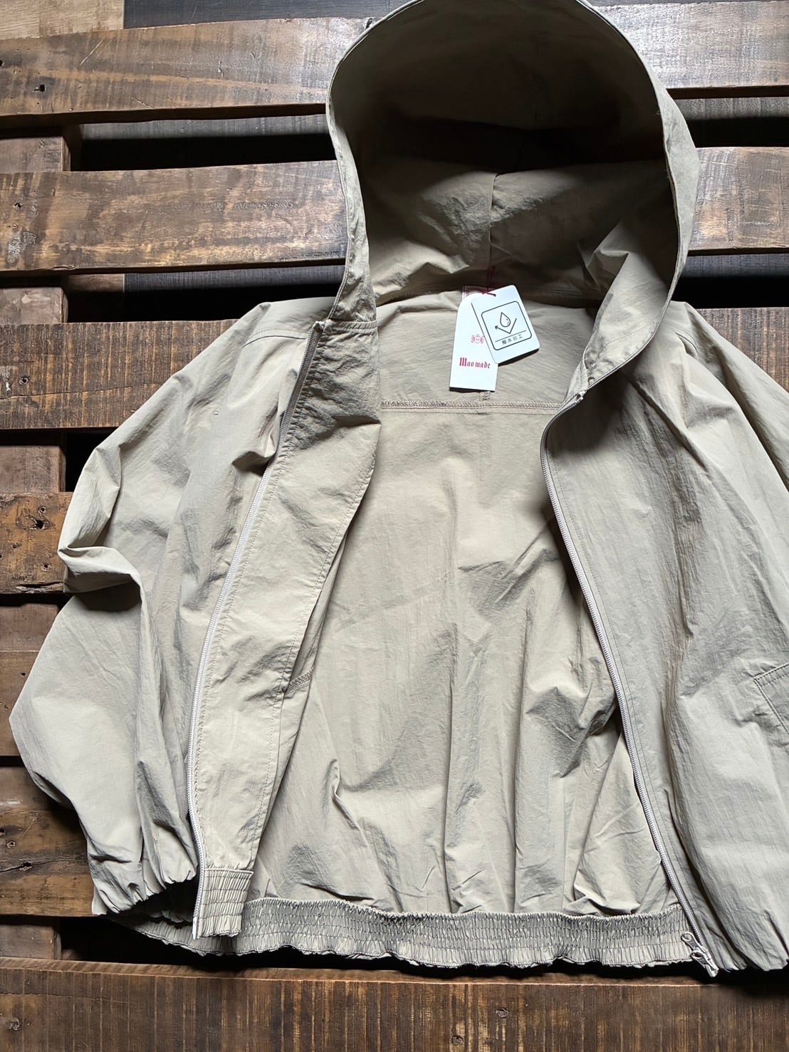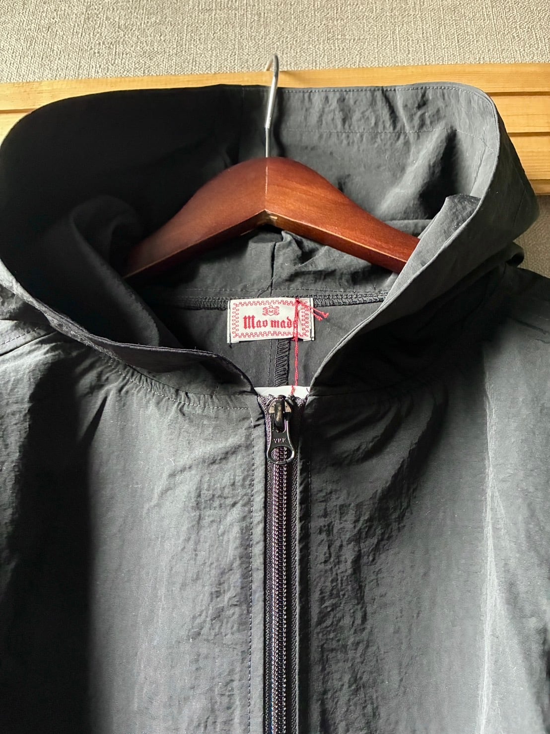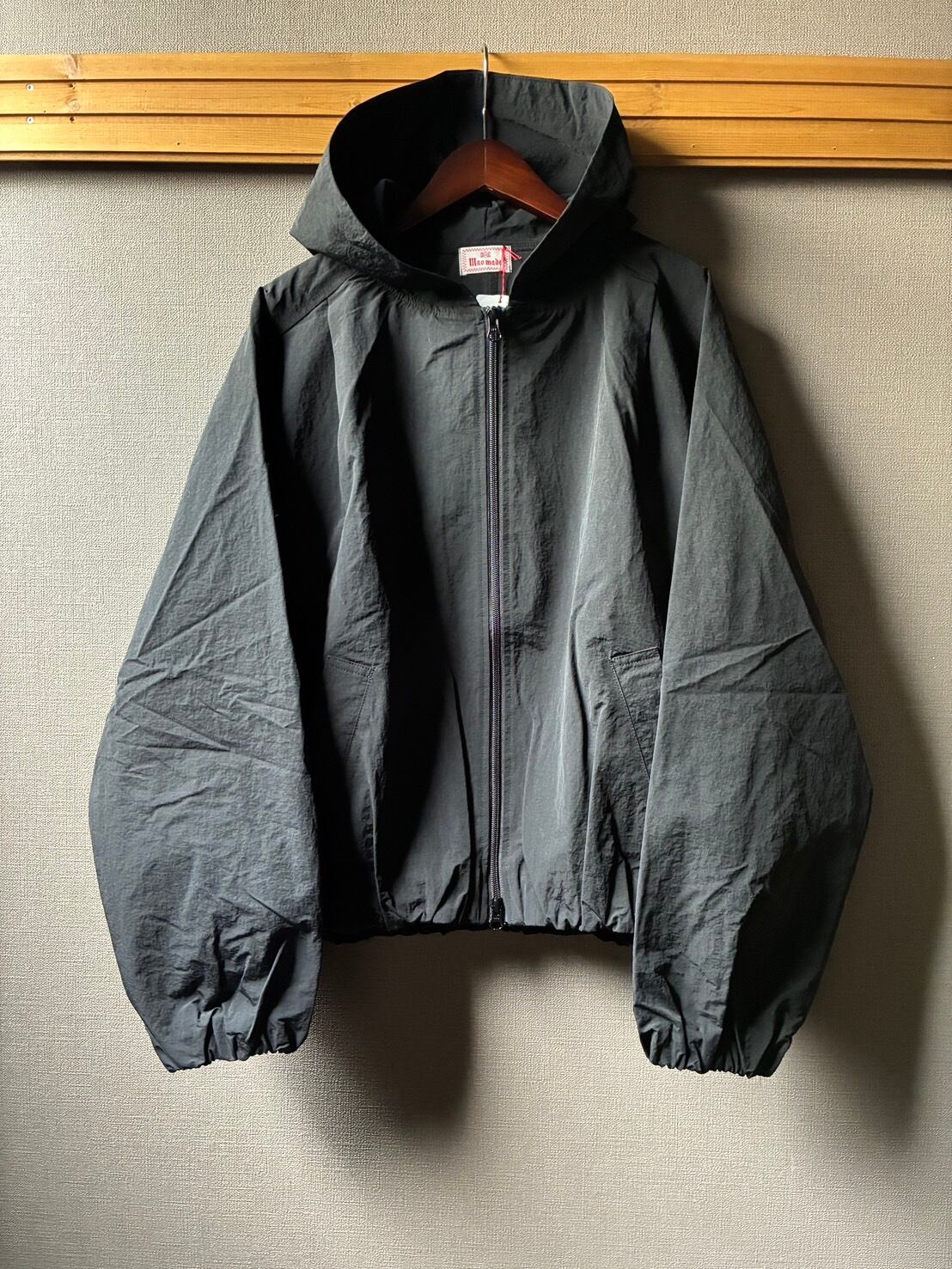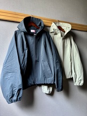 maomadeから撥水加工を施した別注フード付きナイロンジャケットのご紹介です。