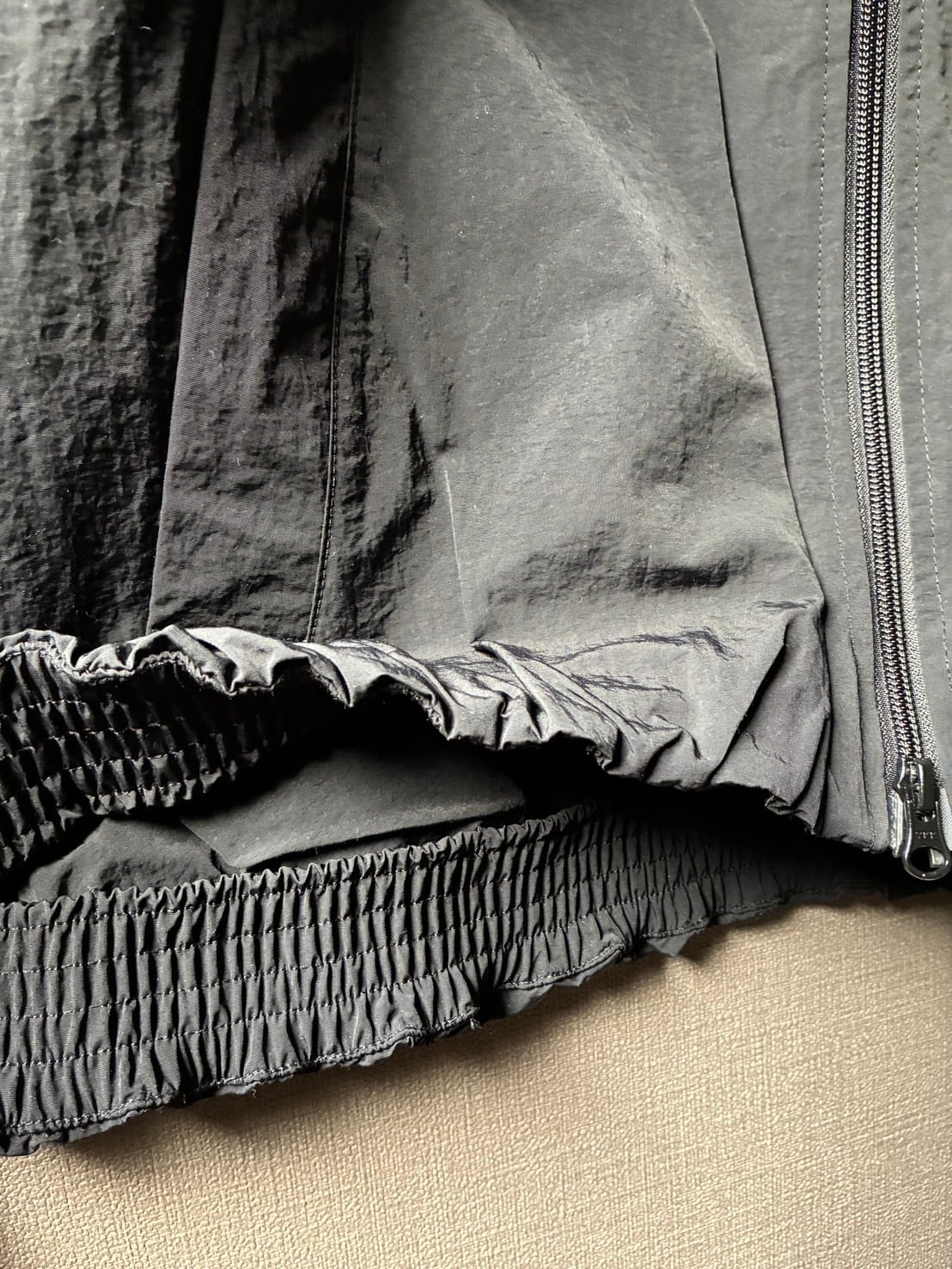 裾にはゴムを入れ、ギャザーを寄せて内側に巻き込みバルーンシルエットに。