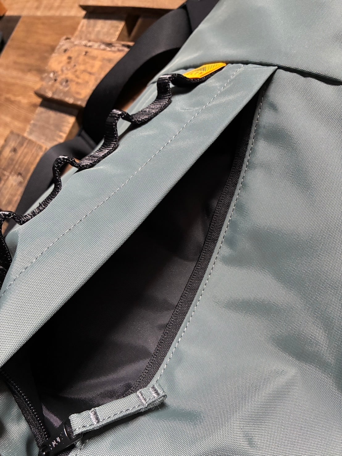 フロントのカラビナなど沢山付けられるループディテールやファスナーポケット付き