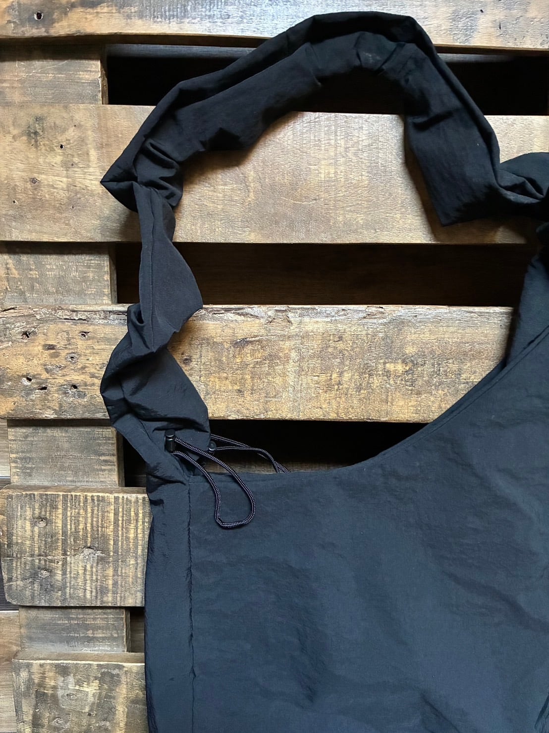 ギャザーを伸ばせば、すっきりとしたシンプルなショルダーとして使うこともできます。
