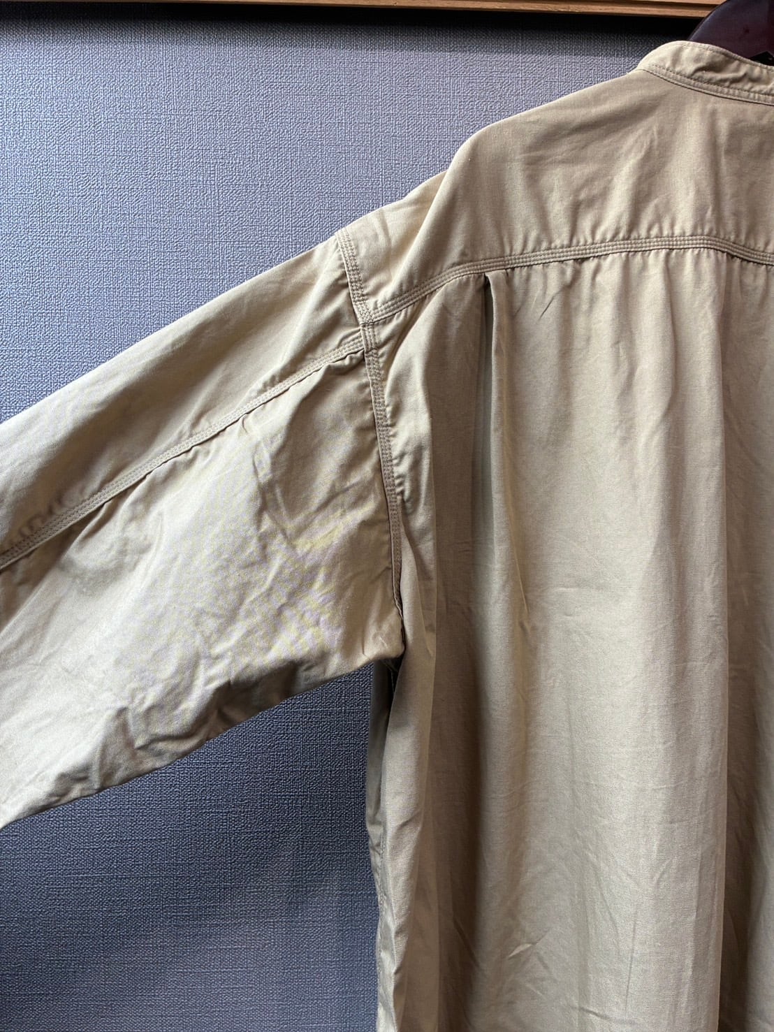 首元はすっきりと立ち感のあるバンドカラーを採用し、肩幅・身幅に大きくゆとりを持たせたリラックスしたシルエットで男女問わず着用できます。