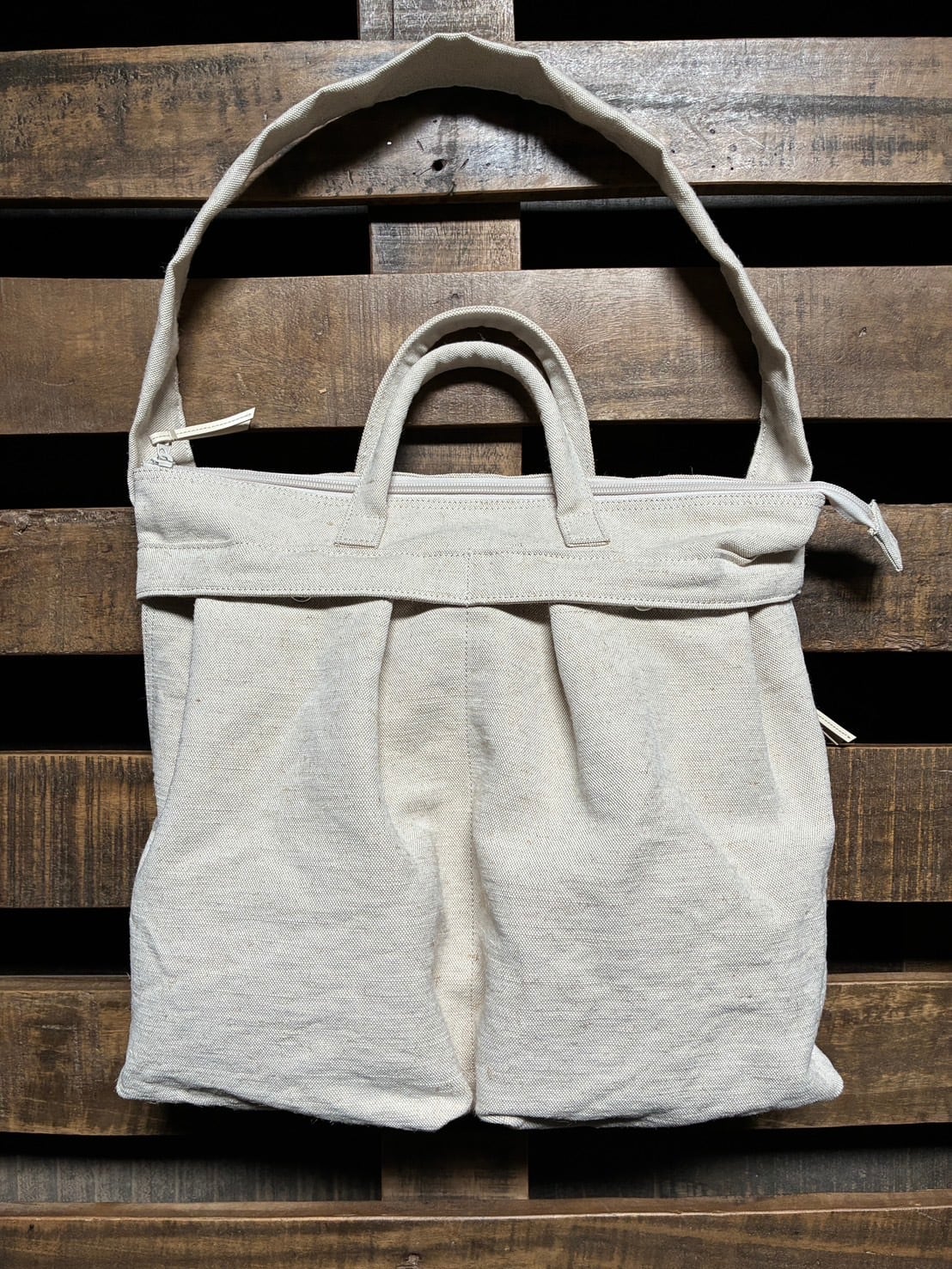 ヴィンテージの風合いのヘルメットバッグ。